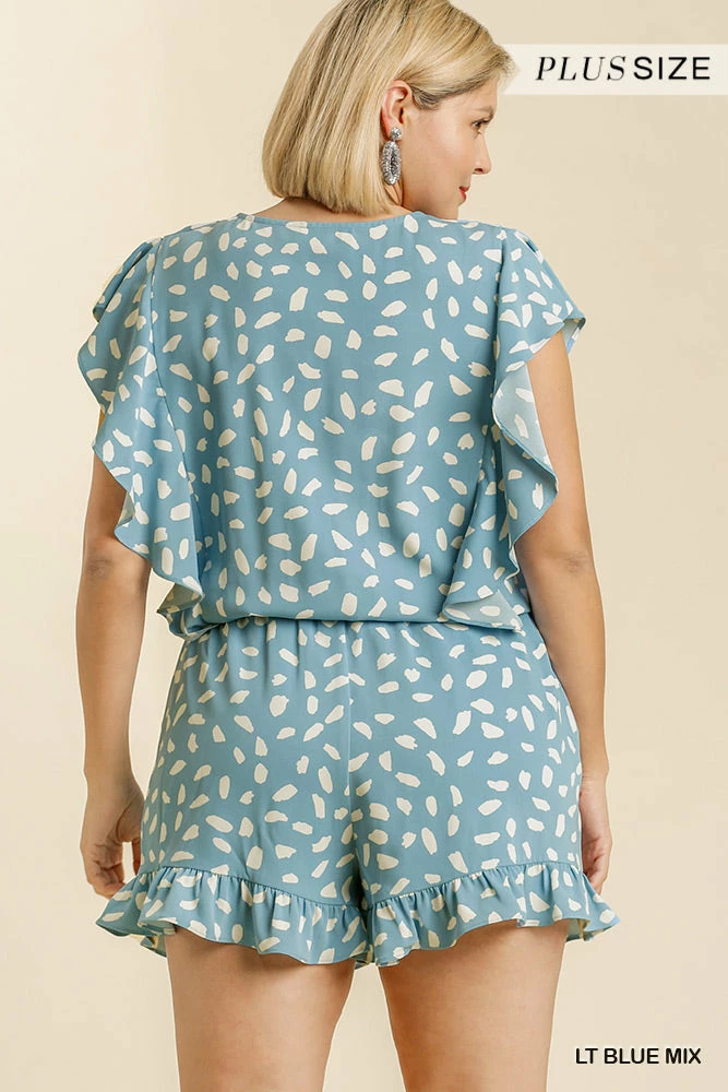 Dalmatian Print Short Ruffle Sleeve V-Neck Crossbody Short Romper with Ruffle Trim