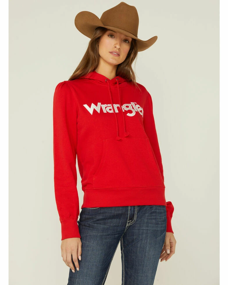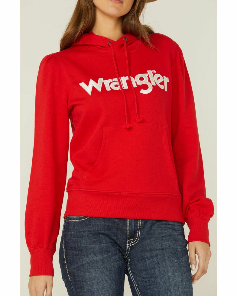 Give every outfit a touch of classic comfort with the Wrangler® puff sleeve logo hoodie. This women’s hoodie is made with a soft, 100% cotton brushed fleece interior for a cozy feel. The casual silhouette features a drawstring hood, kangaroo pocket, and classic logo chest graphic. It’s just what you need for coffee dates, bonfires, holiday parties, and everything in between.