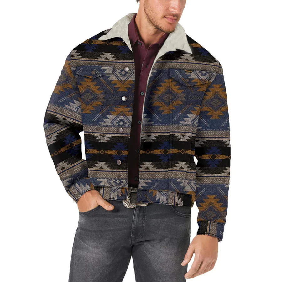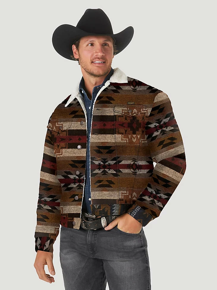 When the cold weather comes, you’ll need a warm alternative to your favorite denim jacket. Our sherpa-lined trucker jacket is a time-tested staple that comes with all the authentic Western styling you know and love about Wrangler jackets, including flap front pockets with ‘W’ stitching and snaps as well as side-hand pockets, a button front, and a cozy sherpa lining and quilted lined sleeves to keep you toasty. It’s crafted from a blend of wool and strong fibers to guarantee long-term durability. Plus, it features a southwestern-inspired print with a colorful twist. It’s perfect for fall, winter, and transitioning between the seasons.