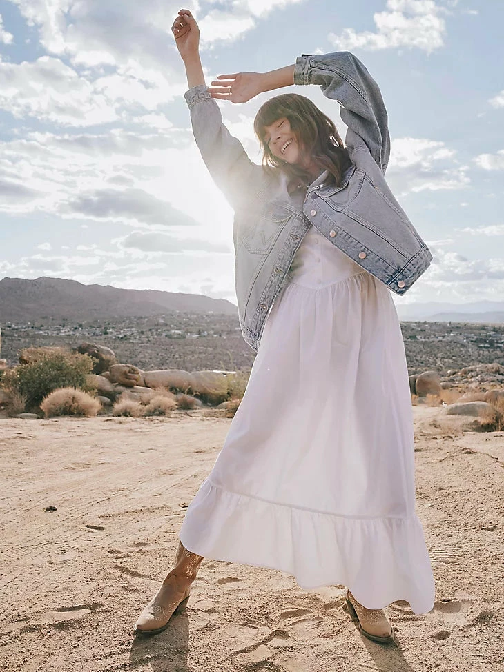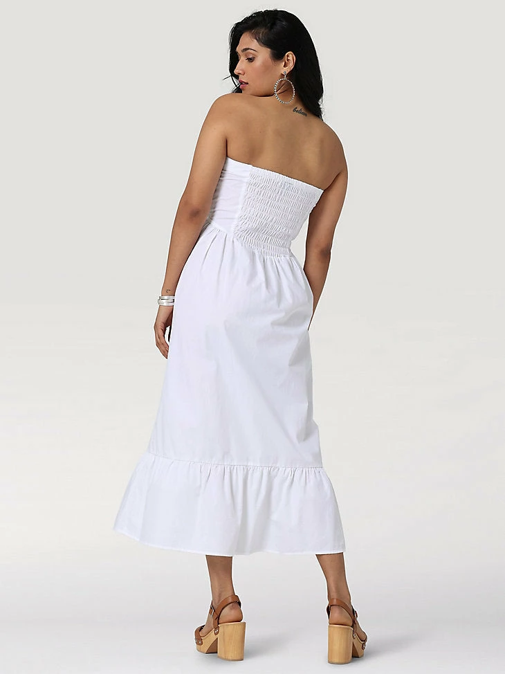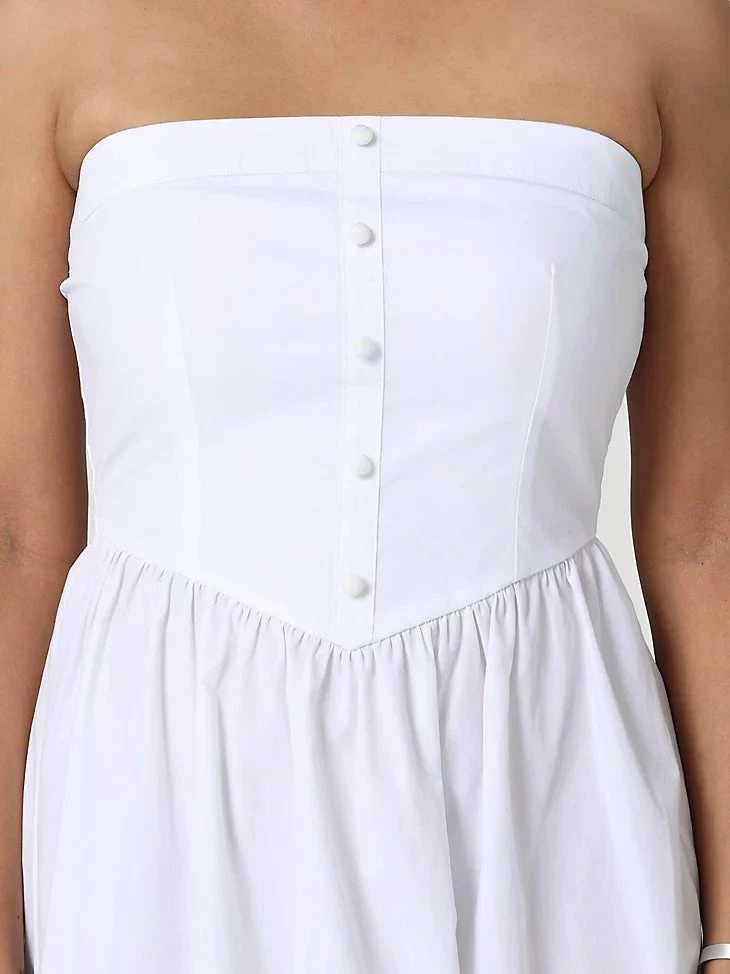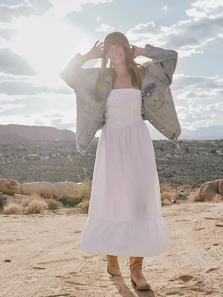 Wrap yourself in summer’s warm embrace with the Wrangler Retro® Americana strapless corset dress. This whimsical take on the classic sundress is built with a wide skirt and strapless top for a dress that’s practically made for twirling. Little buttons down the front add a bit of texture to the feel, ending in a pintucked waist that gives a corseted look without the restraint. Made from 100% poplin cotton, this strapless dress has a soft feeling throughout that you’ll want to wear all season long.