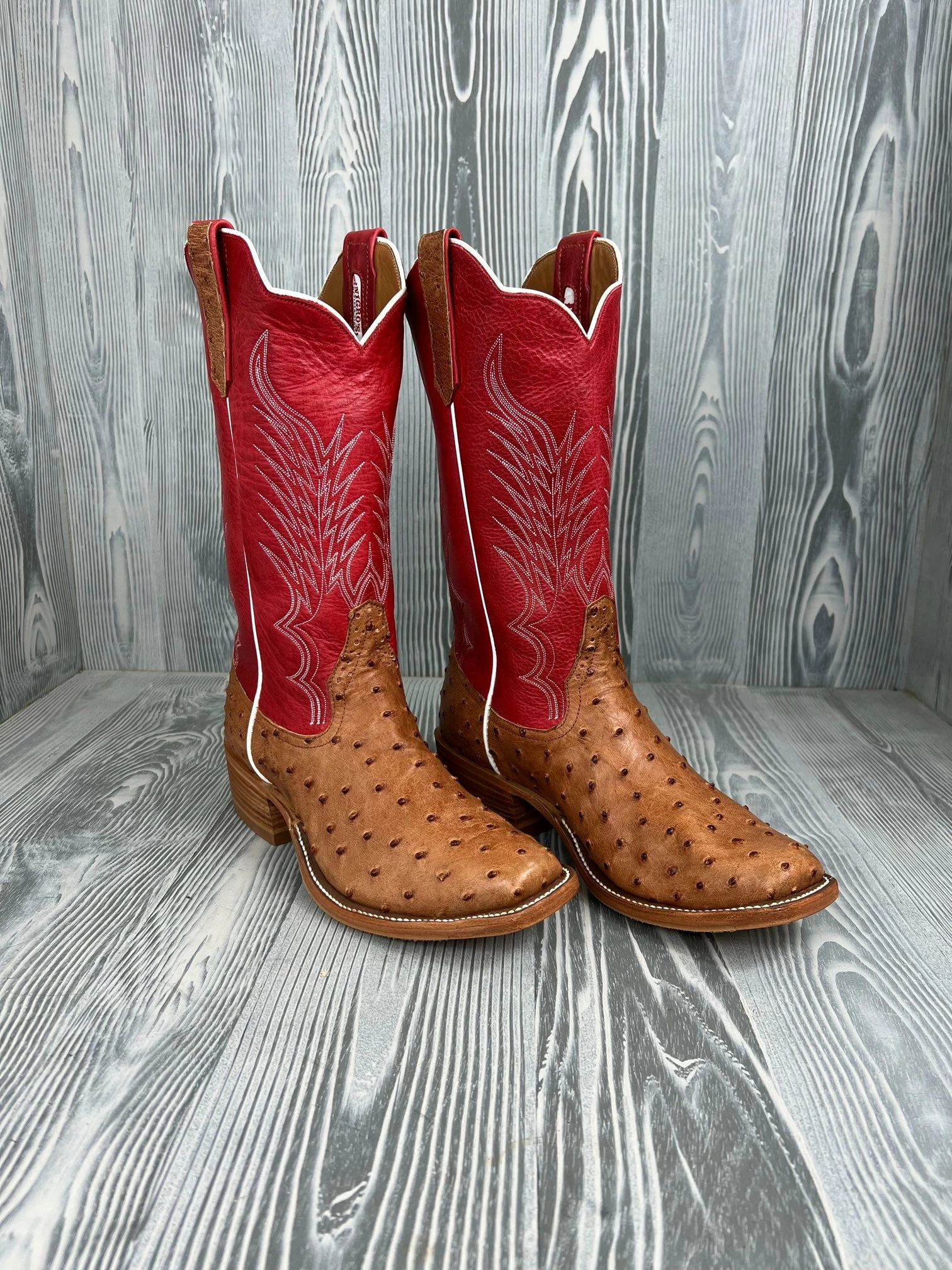 Ostrich is the softest and most comfortable of the “exotic” leathers. It wears well and resists scratching and scuffing – a combination of softness and toughness. Ostrich is naturally resistant to barnyard acid. The quill pattern determines the price of genuine ostrich boots. Where you get a full quill pattern all over the foot, you are buying a much more expensive boot. The size of quill bumps depends on the age of animal and the portion of the hide from which the leather is cut. Ostrich is that ideal combination of durability and wearability which makes it the perfect leather for boots. Always wipe the dust and dirt off ostrich boots after wearing.