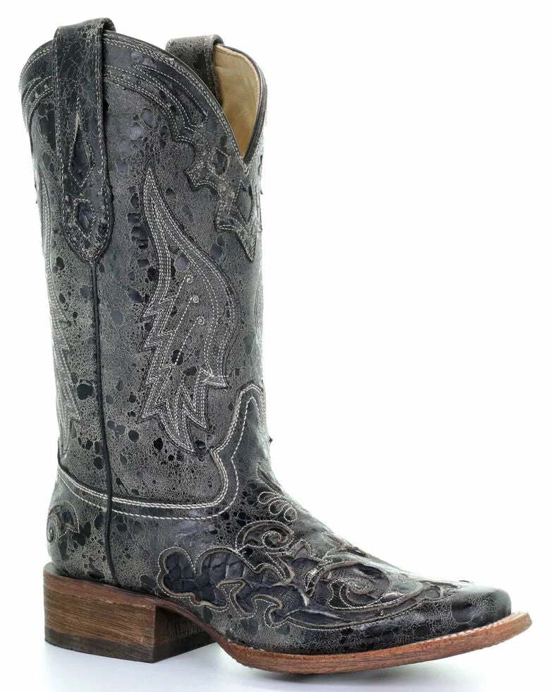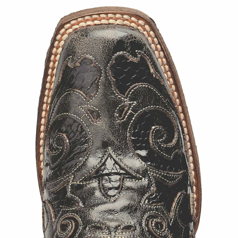 Women’s Corral Distress Black with Python Inlays Square Toe Boots – A2402Â Â